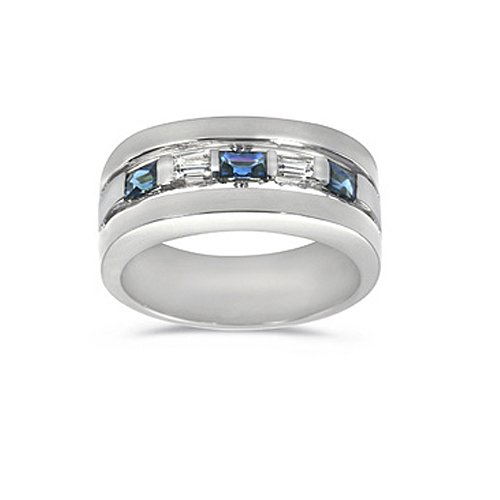 Men's Diamond Ring - Alternating Diamond and Sapphire Men's Ring in Platinum (.20 dia / .55 sap ct. tw. / G Color / VS1-VS2 Clarity) - 9 Overviews Looking for the perfect sapphire and baguette cut diamond combination ring? Look no further! This platinum ring is a gorgeous combination men's ring with alternating near colorless diamond and natural deep blue sapphires. The baguette cut diamonds on this ring are G in color and VS1-VS2 in clarity.